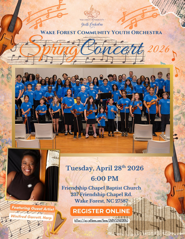 The Wake Forest Community Youth Orchestra provides expert orchestral instruction and free instrument access to K-12 youth in rural and under-resourced communities. Through transformative string music education, we empower students to grow as artists, embrace their creativity, and lead with confidence—nurtured within a supportive community that inspires them to reach their fullest potential.